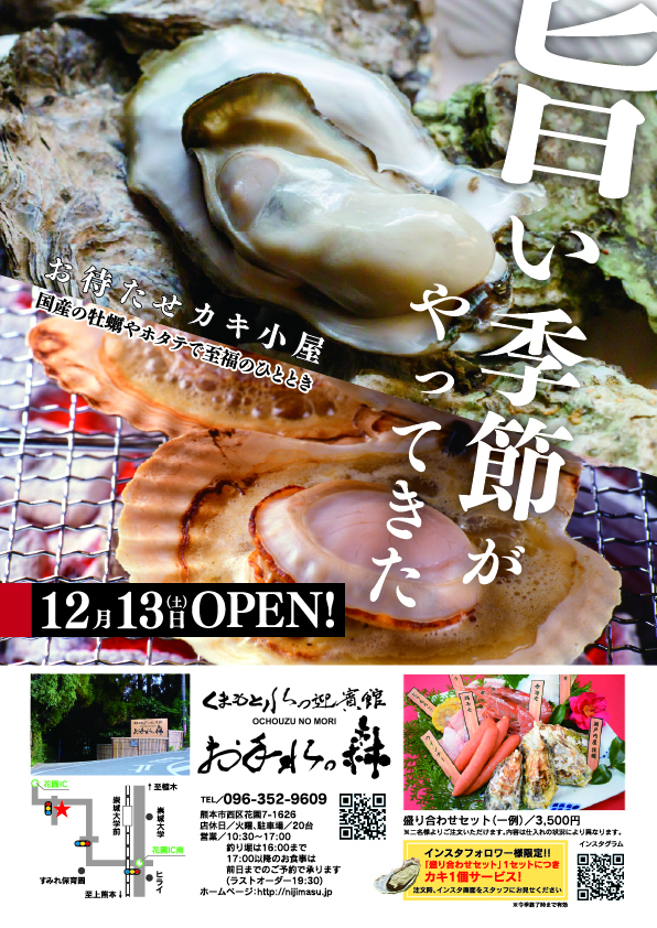 お手水の森に牡蠣小屋が期間限定でOPEN!市街地からのすぐの場所でありながら大自然に囲まれ、ジューシーな牡蠣をはじめ、旨みたっぷりの海産物を楽しめます!インスタグラムをフォローしてくださっている方には特典も👍⭐️チラシをチェックしてみてね🦪